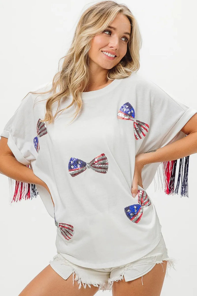 Show off your patriotic pride with this dazzling American flag sequin ribbon t-shirt. The sparkling sequin ribbon design adds a festive touch to your Independence Day outfit. Perfect for celebrating and showing your love for the USA in style. Pair it with denim shorts and sneakers for a casual yet eye-catching look at your Fourth of July festivities.