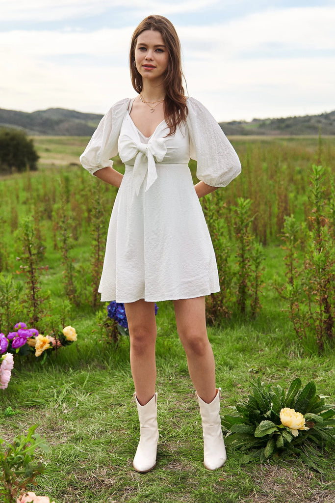 Davi & Dani Self-Tie Puff Sleeve Smocking Open Back Mini Dress