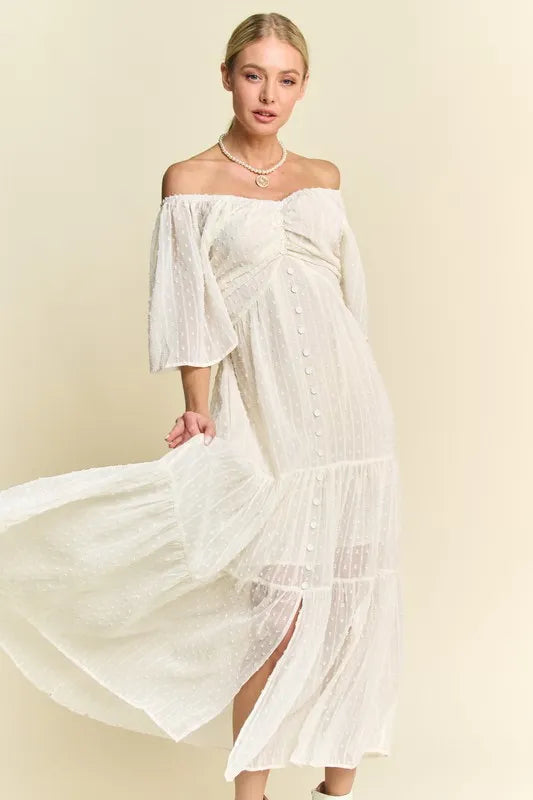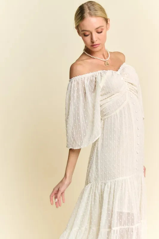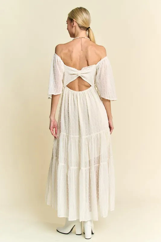 Davi & Dani Swiss Dotted Ruched Ruffle Open Back Midi Dress