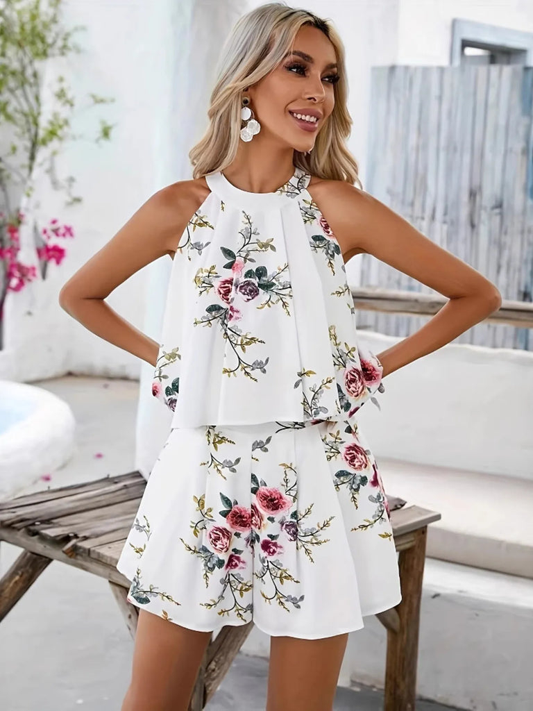 Floral Print Halter Neck Top and Shorts Two-Piece Summer Set