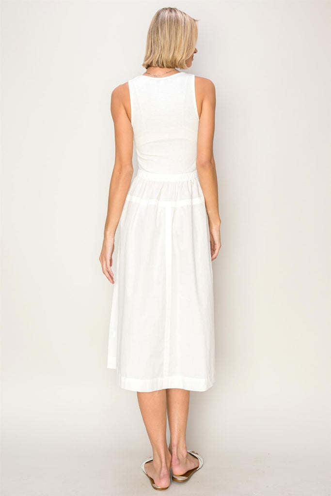 Made from mixed fabric, the close-fitted bodice of this dress is framed with a stylish scoop neck and thick shoulder straps. The curve-defining high waist drops to a flared midi skirt, boasting side patch pockets for added convenience.