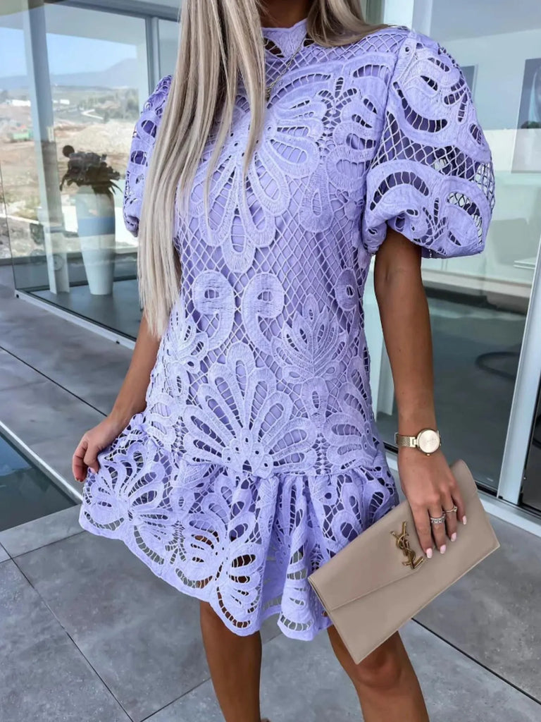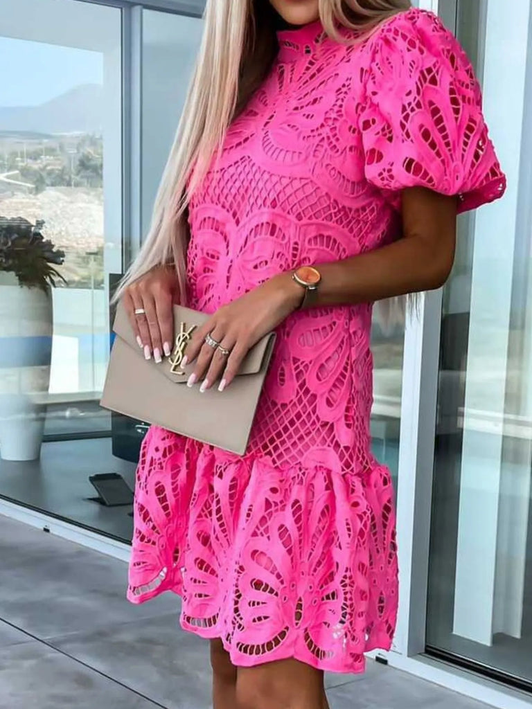 Lace Mock Neck Puff Sleeve Dress