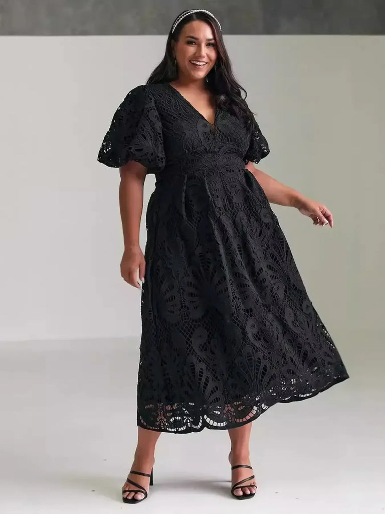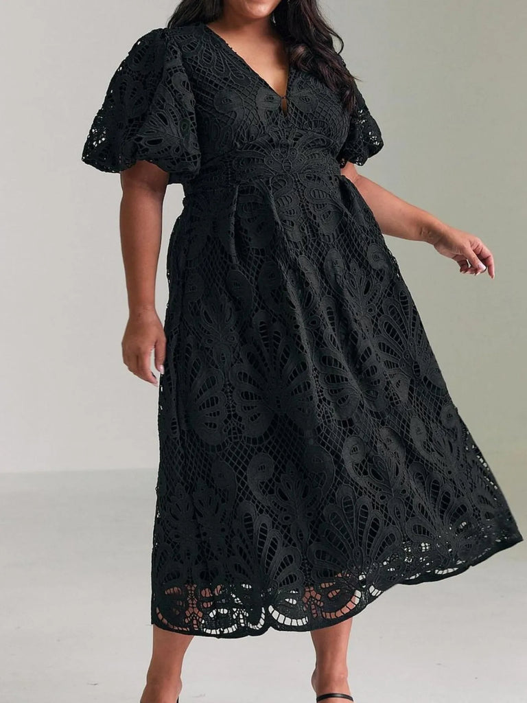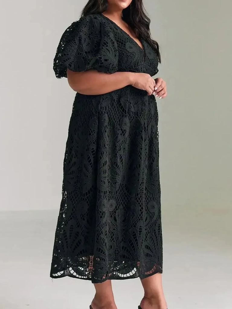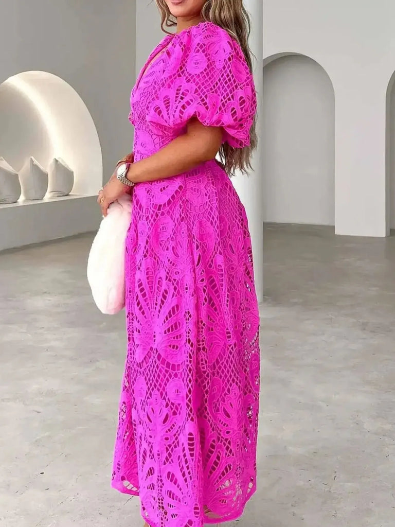 Lace V-Neck Midi Dress with Puff Sleeves