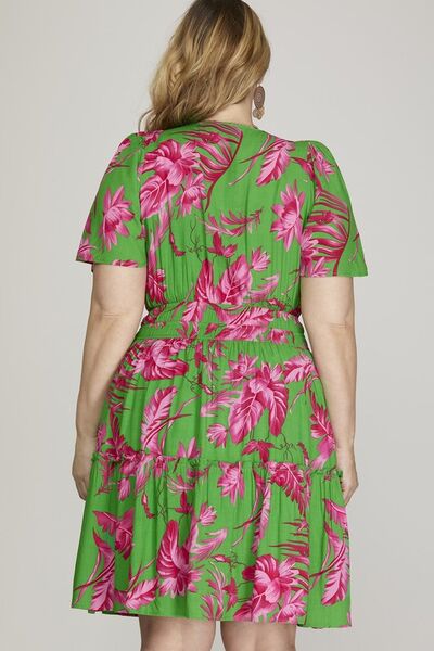She + Sky Full Size Printed Notched Short Sleeve Frill Tiered Dress Plus Size